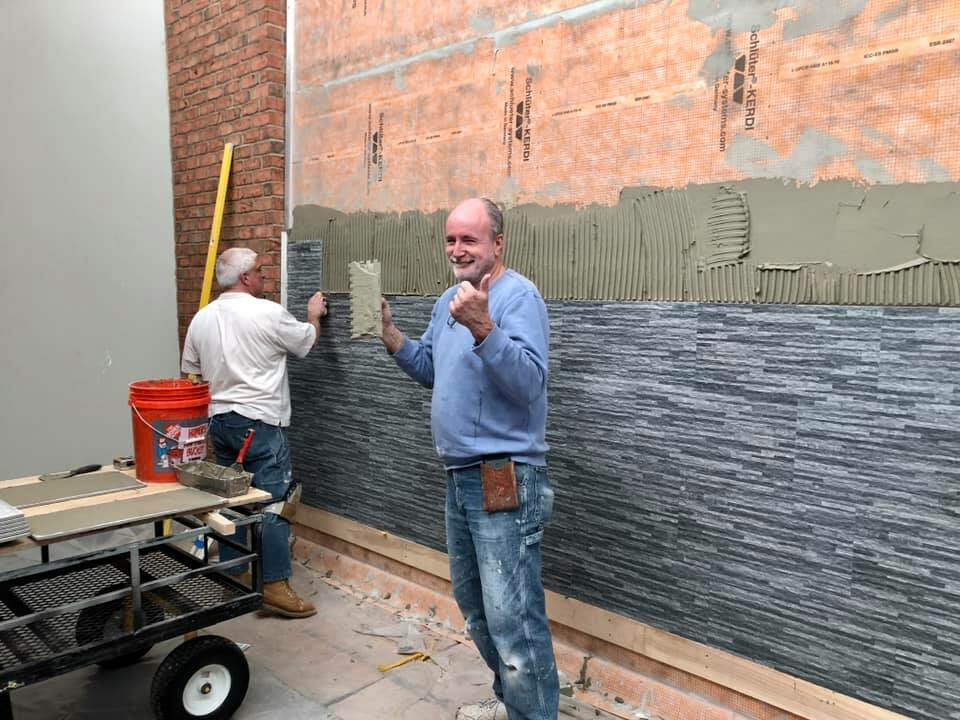 21NovThe Thanksgiving holiday isn’t slowing down work on our lobby water walls. This porcelain tile looks just like natural stone, but will handle the wash of water much better. Thanks, Jonathan, John, and Sal! Enjoy these photos. Click to see more: Share: